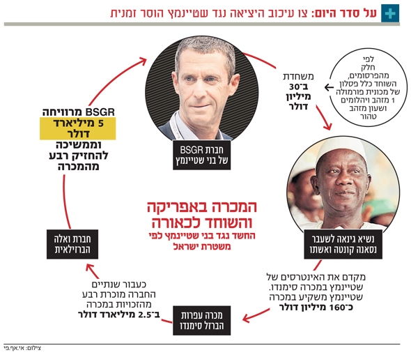 ביאח"ה טוענים כי היקף תשלומי השוחד שהעניק שטיינמץ לנשיא גינאה לשעבר ולאשתו הוא כ־30 מיליון דולר, ובעקבותיהם הרוויח 5 מיליארד דולר. שטיינמץ דוחה את החשדות וטוען כי מדובר במזימה בינלאומית שמטרתה לנשל אותו מנכסים שצבר כדין.