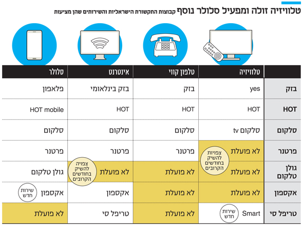 יחסי הכוחות בשוק התקשורת הישראלי עומדים בפני שינוי נוסף, לאחר שבשבוע שעבר קרו ארבעה אירועים משמעותיים שמשנים במידה רבה את מפת התחרות בתחום: ביטול מס הקנייה על מכשירים סלולריים, כניסה של שחקן חדש לשוק הטלוויזיה הרב־ערוצית, כניסה של מפעיל חדש לתחום הסלולר והסכם חדש לשיתוף רשתות סלולר בין שלוש מפעילות. אירועים אלה מגבירים את רמת התחרות בתחום ומחדשים את הלחימה בין השחקניות הגדולות והמבוססות כבזק ו־HOT והשחקניות החדשות יותר, ששואפות לנגוס נתח נוסף מהשוק, אשר נשלט לאורך השנים בידי מספר מצומצם של שחקנים. "כלכליסט" משרטט את מפת התחרות בתחום שבו הצרכן מוציא חודש מאות ואף אלפי שקלים בכל חודש.