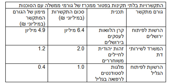 הרשות לפיתוח הנגב והגליל מסרה לסוכנות תכנית חלוקת מלגות לסטודנטים לרפואה בגליל בהיקף של מיליון שקל. הרשות לפיתוח ירושלים העבירה לסוכנות תכנית למתן הלוואות לעסקים קטנים בירושלים בהיקף של 6.4 מיליון שקל. המבקר קבעי כי שלושת המטרות אינן תואמות את תפקידי הסוכנות על פי האמנה ולכן לא היה מקום והתקשרויות באמצעות פטור ממכרז.