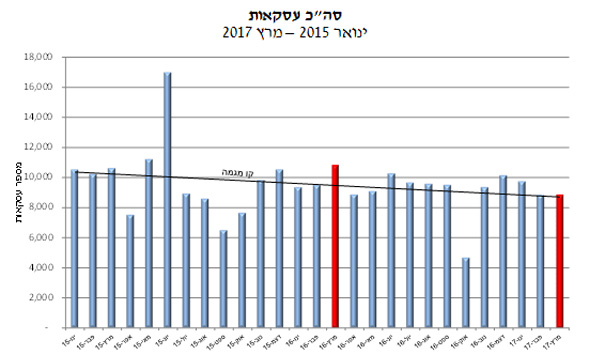 בהשוואה לחודש פברואר זהו גידול של 7%, המתרכז באזור חדרה ובאזור תל אביב. עם זאת, הוסיף הכלכלן הראשי, יש לציין כי גם בשני אזורים אלו נמוך משמעותית מספר העסקאות במרץ השנה בהשוואה למרץ אשתקד - בשיעור של בין 20%-30%.