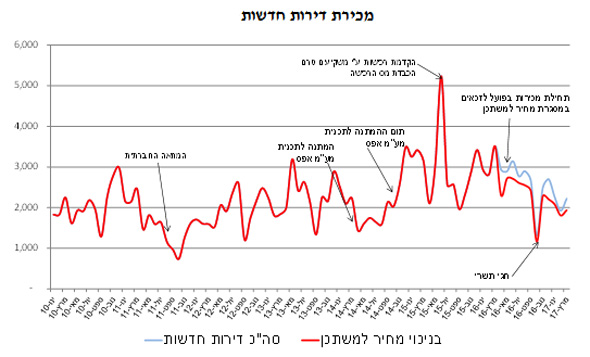 מכירת דירות חדשות בחודש מרץ הסתכמה ב- 2,200 דירות. עוד עולה מהנתונים כי בניכוי מכירות במסגרת "מחיר למשתכן" עמד עהנתון ל 1,900 אלף דירות, ירידה חדה של 46% בהשוואה למרץ אשתקד. זאת "בהמשך לשיעורי ירידה חדים הנרשמים בפרמטר זה מאז אוקטובר אשתקד", כתב הכלכלן הראשי בסקירתו.