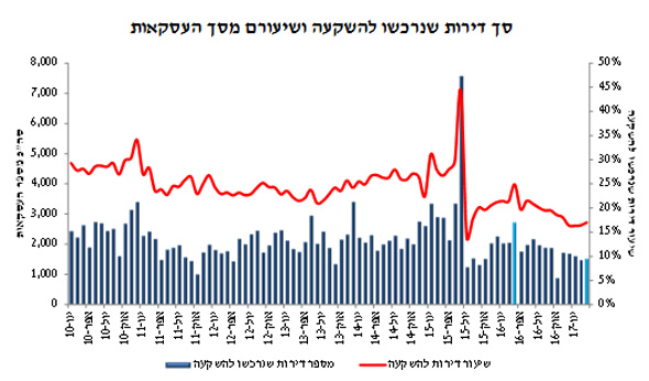 עוד עולה מנתוני סקירת האוצר כי סך הדירות שרכשו המשקיעים בחודש מרץ עמד על 1,500 בדומה לרמתו בחודש הקודם. בהשוואה לתקופה המקבילה אשתקד זוהי כאמור ירידה חדה בשיעור של 44%. כשיעור מסך העסקאות עמד משקל המשקיעים על 17% בעוד שבחודש מרץ אשתקד היוו רכישות המשקיעים רבע מכלל העסקאות בשוק. באוצר ציינו כי ישנה עלייה קלה של 0.5% במספר המשקיעים בין חודש מרץ לפברואר שהיה חודש שיא בשיעור הנמוך במשקל המשקיעים מאז הכבדת המיסוי עליהם ביוני 2015 (אף כי כאמור סך הדירות שרכשו המשקיעים נותר ללא שינוי).