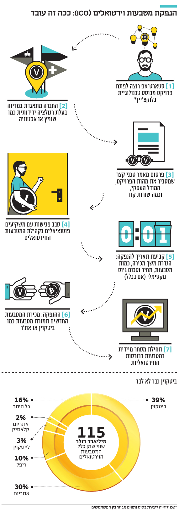 לטרנד הפיננסי הלוהט של 2017 קוראים ICO: הנפקת מטבעות וירטואליים. המשקיעים מסתערים, ומטבעות של חברה בלי מוצר שהנפיקה באפריל כבר שווים 2.5 מיליארד דולר. המבקרים טוענים שזו פירמידה, בעוד היזמים מדברים על מהפכה דומה להמצאת האינטרנט