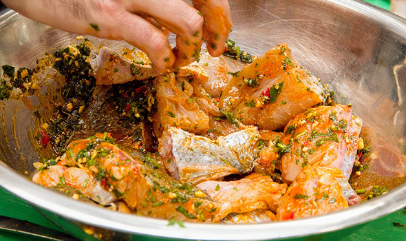 "אחד המאכלים הפופולריים בברזיל בגזרת מאכלי הים הוא המוקקה — דג מתובל בציפוי של קמח יוקה. פה בישראל לא יכולתי להשתמש ביוקה שהבאתי מברזיל כי הוא לא כשר, אז בישלתי עם פירורי לחם ויצא לא פחות טעים. מאכל מוכר נוסף שמבוסס על פירות ים הוא בובו — תבשיל שרימפס שמגיע דווקא מהמקורות האפריקאיים של המטבח הזה".