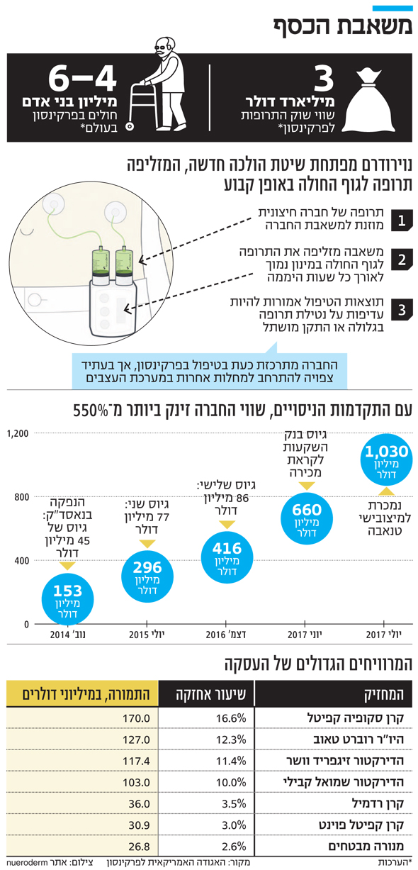 נוירודרם, חברה מרחובות שמפתחת שיטת הולכה חדשה לתרופות למחלות של מערכת העצבים, נמכרת לתאגיד היפני מיצובישי ב־1.03 מיליארד דולר במזומן. אף שהחברה עדיין לא רושמת הכנסות, ההתקדמות המבטיחה של הניסויים בתרופות לפרקינסון שמה אותה על הכוונת של ענקיות פארמה