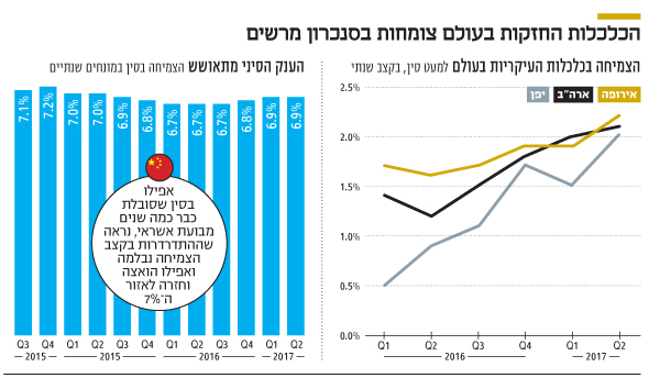 מבחינת הנתונים הכלכליים נראה שהתנאי המאקרו דווקא משתפרים והכלכלות החזקות בעולם צומחות בסנכרון מרשים. הצמיחה בארצות הברית עלתה מקצב שנתי של 1.2% ברבעון הראשון לקצב שנתי של 2.6% ברבעון השני, גוש היורו צמח בשנה האחרונה ב־2.2% ואפילו יפן נהנית ב־12 החודשים האחרונים מצמיחה מפתיעה של כ־2%, עם קצב שנתי של 4% ברבעון האחרון. נקודת אור נוספת מגיעה מסין, הכלכלה השלישית בגודלה בעולם, שסובלת כבר כמה שנים מבועת אשראי וירידה בצמיחה. ברבעונים האחרונים נראה שההתדרדרות בקצב הצמיחה של הכלכלה הסינית נבלמה, ומאז תחילת השנה הצמיחה אפילו הואצה וחזרה לאזור ה־7%.