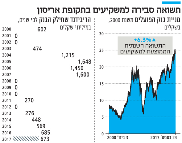 מתחילת שנת 2000 ועד היום מניית בנק הפועלים הוסיפה לערכה 195%, כולל תשואת דיבידנד. גם אם לא מדובר בבוננזה מדובר לכאורה בתשואה שנתית סבירה להשקעה סולידית בבנק, אלא שהנתון הזה מטעה