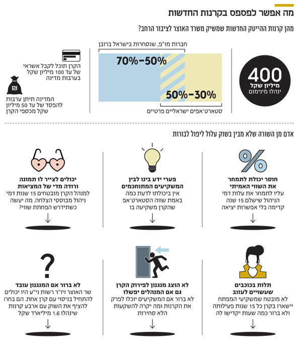 האוזר וכחלון נישאים גם על גלי הישג: המדינה מוכנה לתת רשת ביטחון בדמות ערבות מדינה להפסד של כ־10% מנכסי הקרן בנקודת היציאה. על הקרנות לגייס לפחות 400 מיליון שקל מהציבור ומהגופים המוסדיים כדי לצאת לדרך, וגובה הכרית עומד על כ־50 מיליון שקל. אם לא די בכך, הקרנות ייסחרו בבורסה ויהיה להן ציטוט שווי יומי. לפני שהרכבת יוצאת לדרך בלי אפשרות חזרה, חשוב להציף את השטח המת שנראה שנעלם מהחזון הגדול של הוגיו - נקודות שבהיעדר התייחסות עלולות לעלות למשקיעים ביוקר.