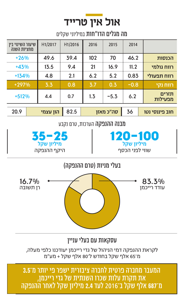 מה שמנסה למכור אול אין טרייד בהנפקה, כפי שעולה מטיוטת התשקיף, הוא בעיקר את נתוני הצמיחה. אחרת, קשה להצדיק לפי הנתונים הפיננסיים במאזן החברה את השווי המדובר. לאול אין טרייד הון עצמי של 20.9 מיליון שקל והרווח שנתי ב־2016 עמד על 3.7 מיליון שקל. הרווח הנקי במחצית הראשונה של 2017 עמד על 3.2 מיליון שקל, שיפור ניכר לעומת רווח נקי של 825 אלף שקל בינואר־יוני 2016.