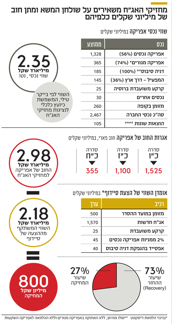 איך שלא מסובבים את זה, מחזיקי האג"ח משאירים על שולחן המשא ומתן חוב של 800 מיליון שקל לפחות של אפריקה כלפיהם. למה לפחות? כי אין דין האג"ח הישנות, שנושאות ריבית של 6.5% ויותר, כדין סדרת האג"ח החדשה, שנושאת ריבית של 4%. יוצא אפוא ששיעור התספורת בהסדר מגיע ל־27%, ולמי שרוצה לראות את שלושת רבעי הכוס המלאה: שיעור ההחזר מגיע ל־73%.