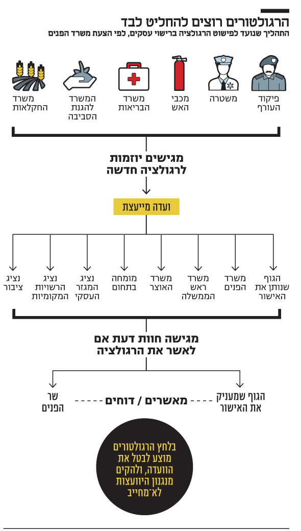חילוקי דעות מאיימים לעקר מרכיב מרכזי ברפורמה המתוכננת בהליכי רישוי והקמה של עסקים. מנוסח ההחלטה שמגבש משרד הפנים נמחק ביממה האחרונה כל זכר לוועדה משותפת לממשלה, לרגולטורים ולמגזר העסקי, שהיתה אמורה לצמצם דרישות רגולטוריות חדשות.