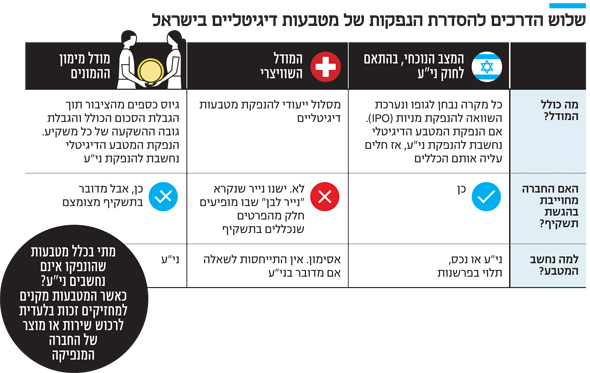 על רקע הזינוק המטאורי בערכו של הביטקוין והסערה שהמטבע הדיגיטלי מחולל בעולם הפיננסי, רשות ניירות ערך בוחנת שלושה מודלים — המודל השוויצרי, מודל מימון ההמונים או השארת המודל הקיים — להסדרת הנפקות ראשוניות של מטבעות דיגיטליים (Initial Coin Offering, או בקיצור — ICO) בישראל. לפי ההערכות, מסתמנת העדפה למודל מימון המונים.