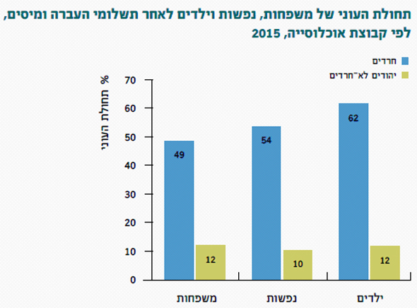 עם זאת, מדובר בירידה איטית מאוד בשיעור העוני והוא עדיין גבוה בהרבה מזה שבקרב משפחות יהודיות ולא יהודיות (49% לעומת 12%). יתרה מזאת, בגלל מספר הילדים הגבוה שיעור הנפשות מתחת לעוני בקרב החברה החרדית גבוה עוד יותר – 54%.