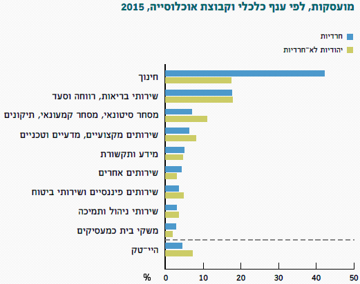 במשך שנים ארוכות הנורמה במגזר החרדי קבעה שנשים צריכות לעבוד בהוראה וזו הייתה ההכשרה המקצועית היחידה כמעט שניתנה בסמינרים החרדיים, המקבילים לתיכונים בחינוך הכללי. בעשורים האחרונים החלה בסמינרים הכשרה גם למקצועות אחרים וכן יציאה של נשים חרדיות לאקדמיה. מגמה מעודדת שזוהתה בשנתון היא ירידה בשיעור הנשים שעוסקות בחינוך מ-64%, כמעט שני שליש מהנשים החרדיות ב-2001, ל-42% היום. אלא שגם שעור זה גבוה פי 2.5 משעור הנשים היהודיות הלא חרדיות שמועסקות בחינוך – 17%.