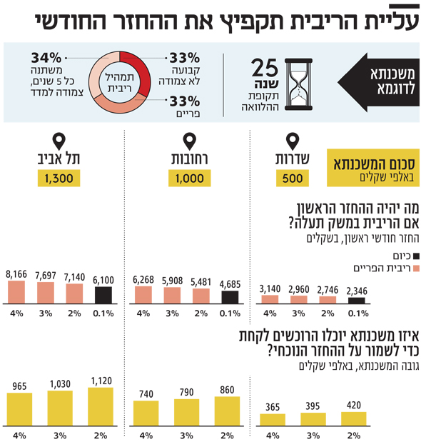 אלא שכעת בדק "כלכליסט" מה יהיה גובה ההחזר הראשוני למי שירצה לרכוש דירה לראשונה ביום שבו הריבית תעמוד על 2% או 3% או 4%. הנתונים שחושבו בסיוע AMG משכנתאות – חברה לייעוץ וליווי נוטלי משכנתאות, מראים כי בתרחיש בו זוג צעיר ירצה לקנות דירה ביום שהריבית תעמוד על 4% ההחזר החודשי שהוא ישלם יהיה גבוה ב-34% לעומת ההחזר החודשי של זוג שקונה היום דירה. ב-AMG הצליחו אף להציג תמהיל משכנתא כזה שההחזר החודשי היום (כשהריבית עומדת על 0.1%) נמוך יותר מזה שהצגנו בכתבה הראשונה בגלל פריסה יותר ארוכה של התשלום (בתמהיל המקורי רכיב הפריים נלקח ל-25 שנה ורכיבי הריבית המשתנה והריבית הקבועה ל-20 שנה ואילו בתמהיל החדש המקל יותר התמהיל כולו הוא לתקופה של 25 שנה). התמהיל של המשכנתא התחלק כך: כשליש בריבית פריים, שליש בריבית משתנה כל 5 שנים ושליש ריבית קבועה לא צמודה - כולן לתקופה של 25 שנה.