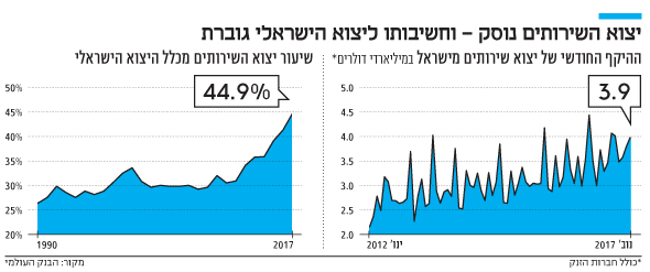 המספרים מדברים בעד עצמם: בחמש השנים האחרונות הכפיל המשק הישראלי את יצוא השירותים, מ־2 מיליארד דולר לחודש ל־4 מיליארד. יצוא השירותים בשנת 2017 צפוי להסתכם בכ־45 מיליארד דולר, והוא גדל מהר הרבה יותר מיצוא הסחורות. הנתון המרשים ביותר נוגע למשקל היחסי של יצוא השירותים: אם לפני עשור הוא היווה כ־30% מהיצוא, השנה הוא צפוי להגיע כמעט ל־45% ממנו, והתחזיות מראות שבשנה הבאה הוא כבר ישתווה ליצוא הסחורות (ללא יהלומים).