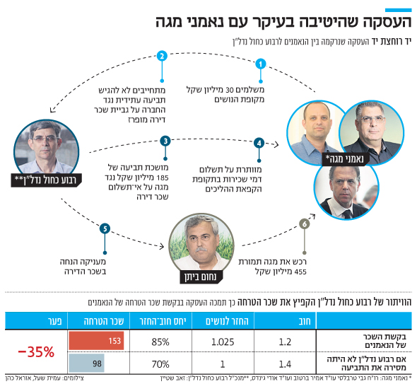 חודש וחצי אחרי שהנאמנים הגישו דרישת שכר של 153 מיליון שקל, הם ביקשו מבית המשפט לאשר הסכם לוויתור על כל תביעה עתידית של נושי מגה כלפי רבוע נדל"ן - חברה־אחות של מגה. במסגרת ההסכם, הנאמנים התחייבו לשלם לרבוע נדל"ן 30 מיליון שקל מקופת הנושים ולא להגיש נגדה כל תביעה. בתמורה, רבוע נדל"ן ויתרה על חוב דמי שכירות שהנאמנים היו חייבים לשלם לה בתקופת הקפאת ההליכים, משכה תביעת חוב שהגישה נגד מגה והעניקה הטבות מפליגות של עשרות מיליוני שקלים בשכר הדירה לנחום ביתן, בעל הבית הנוכחי של מגה, שרכש אותה מהנאמנים ביוני 2016 תמורת 455 מיליון שקל.