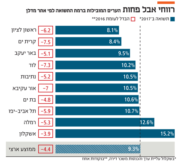 רשימת הערים המובילות בתשואות הגבוהות נותרה זהה לזו של 2016. עם זאת, דירוג הערים השתנה, במיוחד בכל הקשור לתשואה על ההון. את התשואה על ההון הובילה בשנת 2017 אשקלון, עם עליית שווי של 12%, ירידה של שלוש נקודות האחוז לעומת 2016, שגם בה ניצבה בראש הטבלה. במקום השני מדורגת רמלה עם תשואת הון של 9.2%, לעומת 13.8% ב־2016, בתל אביב חלה עליית שווי ממוצעת של 8.2%, לעומת 13.8% ב־2016, ובבת ים ובנתיבות חלה עליית שווי של 7.7%.