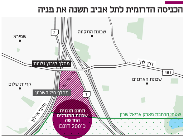 רשות מקרקעי ישראל מקדמת תוכנית לבניית שכונת מגדלים בכניסה הדרומית לתל אביב. ל"כלכליסט" נודע כי שמה של התוכנית שער דרום, והיא צפויה להתפרס על שטח של כ־200 דונם התחום במשולש שנוצר מדרום למחלף קיבוץ גלויות, בין כביש 1 ונתיבי איילון (כביש 20). השכונה תתחבר לשטח שאליו צפוי להתרחב פארק אריאל שרון.
