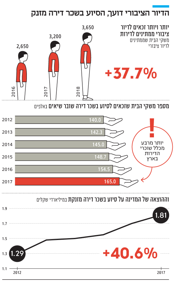 דעיכת הדיור הציבורי בשנים האחרונות היא אחת הסיבות לזינוק בתקציב הסיוע בשכר הדירה של משרד הבינוי והשיכון - סיוע שניתן למשקי בית במצב סוציו־אקונומי קשה. ל"כלכליסט" נודע כי תקציב זה זינק ב־40.6% בתוך חמש שנים בלבד. ב־2017 עמד תקציב זה בפועל על 1.8 מיליארד שקל, בעוד ב־2012 גובהו עמד על 1.3 מיליארד שקל בלבד.
