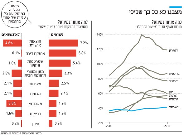 אלא שמצבה של ישראל הוא עדיין הטוב והיציב ביותר בין כל המדינות המפותחות. אם בישראל היחס בין אשראי משקי הבית לתמ"ג עלה מכ־35% ב־2008 ל־41% ב־2016, באוסטרליה ובשוויץ הוא חצה לאחרונה את הרף של 120%. ממוצע ה־OECD עומד על 66%.