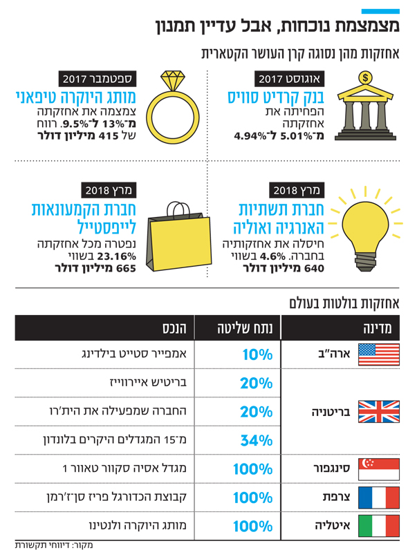 בחודש שעבר מכרה הקרן את אחזקותיה בענקית תשתיות המים הצרפתית ואוליה תמורת 640 מיליון דולר. זאת נוסף על צמצום אחזקותיה בחברת מוצרי היוקרה טיפאני ובבנק קרדיט סוויס. עם זאת, לקרן העושר יש עדיין אחזקות במגוון חברות בינלאומיות, מבנק ברקליס ונדל"ן יוקרה ועד בתי אופנה אירופיים מובילים.