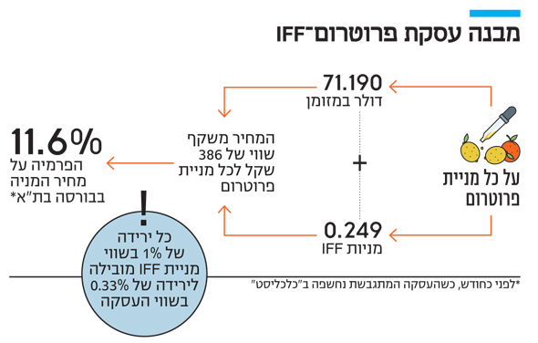 מתווה העסקה, כפי שדיווחה IFF, כולל תשלום במזומן של 71.19 דולר לכל מניית פרוטרום, בתוספת עוד 0.249 מניה של IFF. שווי המניה, על בסיס ממוצע ב־10 ימי המסחר האחרונים שקדמו לעסקה, משקף למניית פרוטרום שווי של 106.25 דולר, שהם 386 שקל. המשמעות היא שרכיב המזומן שישולם למחזיקי המניות של פרוטרום הוא 67% מהמחיר לכל מניית פרוטרום, והיתרה תינתן במניות IFF, שירדו אתמול בניו יורק ב־6.7% נכון לשעת סגירת הגיליון.