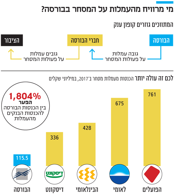 לעומת זאת, ב־2017 הבורסה עצמה גבתה מכל חברי הבורסה שלה 115 מיליון שקל בלבד. הבנקים כמובן זכאים לקבל עמלת תיווך עבור הקישור בין הציבור למסחר בבורסה, אבל המרווח מהעמלות שהם עצמם משלמים כה גדול, שכלל לא בטוח שהבעיה בעמלות המסחר הגבוהות בישראל טמונה בתעריפון הבורסה.
