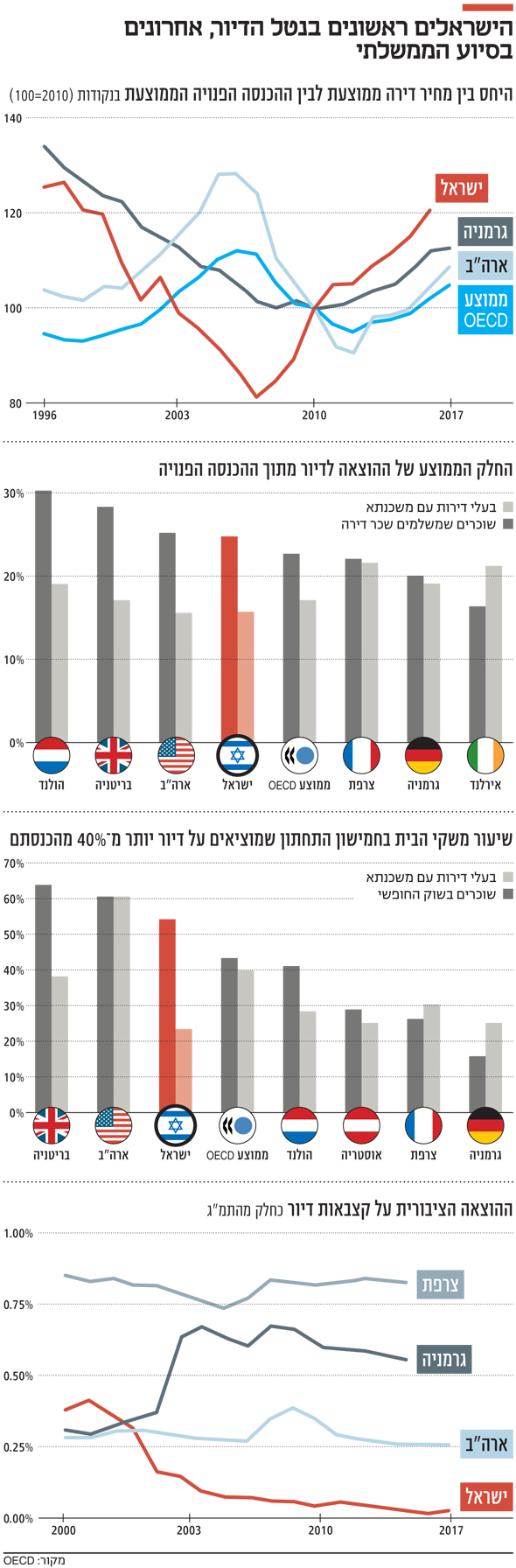 זה שיעור עצום שקשה למצוא כמותו בשאר המדינות המפותחות. בבמוצע, 45% מתושבי מדינות ה־OECD שבשני העשירונים התחתונים מקדישים לדיור חלק גדול כל כך מהכנסתם. שתי המדינות היחידות שמצבן קשה יותר מזה של ישראל הן ארה''ב ובריטניה. במדינות כמו גרמניה, צרפת ואוסטריה, שבהן יש תרבות שכירות מפותחת, המשקל מגיע לפחות מ־30%.