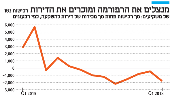 העלייה החדה במכירת הדירות לצד רכישות מועטות מצד משקיעים הביאו לכך שנתוני ה"רכישות נטו" שלהם - סך הרכישות פחות סך המכירות - הראה נתון שלילי של 1,900 דירות. כלומר מגזר המשקיעים "שחרר" 1,900 דירות במצטבר לציבור הלא משקיעים. בסך הכל, בשנתיים האחרונות (מהרבעון השני ב־2016 ועד הרבעון הראשון של 2018), שחרר מגזר המשקיעים לציבור 10,000 דירות. לשם השוואה, בשמונת הרבעונים שקדמו להיפוך המגמה זה, התווספו למלאי "רכישות הנטו" של המשקיעים 14 אלף דירות.