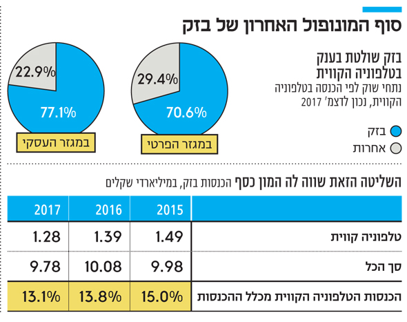 משרד התקשורת פרסם בחודש שעבר נתונים על נתח השוק של בזק בתחום הטלפוניה, בחלוקה למגזר הפרטי ולמגזר העסקי. מהנתונים עולה כי מיוני 2016 ועד דצמבר 2017 אחיזתה של בזק בשוק הפרטי כמעט לא השתנתה. ביוני 2016 היא החזיקה ב־70.4% מהשוק הפרטי, בעוד בדצמבר 2017 החזיקה ב־70.6%.במגזר העסקי המצב דומה. ביוני 2016 נתח השוק של בזק הסתכם ב־72.5%, לעומת 77.1% בדצמבר 2017.