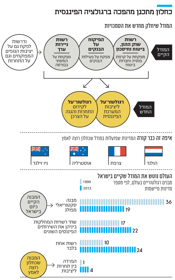 לשר האוצר משה כחלון יש חזון חדש למערכת הפיננסית הישראלית: "במקום רגולטורים סקטוריאליים - רשות לשוק ההון, רשות לניירות ערך ופיקוח על הבנקים - יהיו שני רגולטורים בלבד", כך חושף כחלון בראיון ל"כלכליסט".