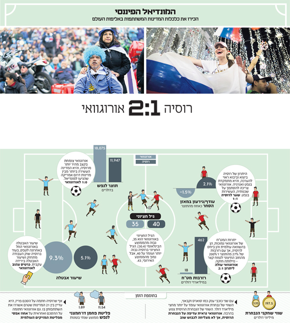 סיכום המשחק: הכלכלה הרוסית המתאוששת לא הצליחה לגבור על הכלכלה היציבה של אורוגוואי. בעוד רוסיה כבר הבטיחה את מקומה בשמינית הגמר, לאורוגוואי לא תהיה בעיה אמיתית להצטרף אליה וכלכלתה הקטנה מנצחת בקרב הפיננסי. רוסיה, שכלכלתה נתמכת במחירי הנפט העולים, תמשיך לקוות כי הקהל הבינלאומי, ובעיקר האירופי, יתרשמו מאירוח המונדיאל; זאת כי אירופה היא יעד ל־55% מהיצוא הרוסי.