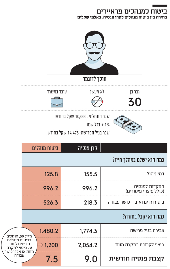 התוצאות מדהימות. החוסך בקרן פנסיה יקבל קצבה של 8,986 שקל בחודש, בעוד שהחוסך בביטוח מנהלים יצטרך לחיות מ־7,497 שקל בחודש ‑ כמעט 17% פחות. אם לא די בכך, מאחר שרכיב הביטוח מתייקר עם הגיל, ומאחר שהחוק אוסר על חברות הביטוח למשוך יותר מ־35% מההפקדות לצורכי ביטוח ‑ גם הכיסוי הביטוחי שהחוסך יהיה זכאי לו במקרה מוות או אובדן כושר עבודה יתכווץ מאוד בהגיעו לגיל 50‑60.