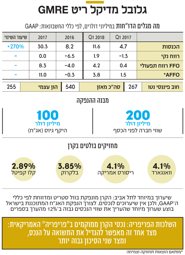 גלובל מדיקל ריט, שנסחרת ב־NYSE לפי שווי של 200 מיליון דולר, יוצאת לרוד שואו בתל אביב עם יעד גיוס של 100 מיליון דולר באג"ח. הקרן קטנה, שעיקר נכסיה ב"פריפריה" של ארה"ב, רוצה לפצות את המשקיעים עם שיעבוד ראשון על נכסים