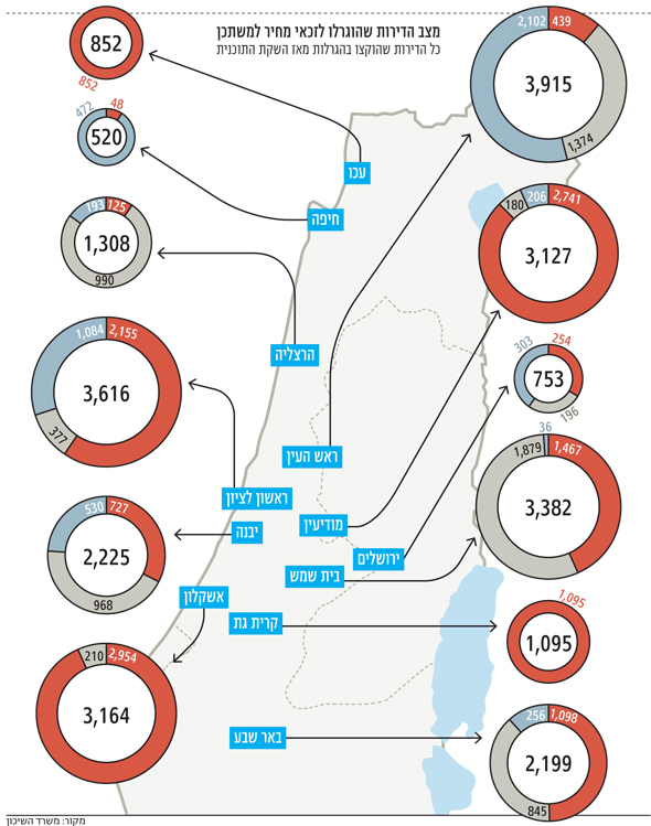 ניתוח הנתונים העדכניים של משרד השיכון באתר התוכנית מראה שבישובים מסוימים אלפי זוכים עוד ממתינים להיתר המיוחל. בראשון לציון, 3,616 דירות כבר הוקצו לזוכים אבל רק 1,084 מהן קיבלו היתר. יותר מ־2,100 זוכים עדיין מחכים. במודיעין כבר הוגרלו 3,127 דירות, אבל רק ל־206 מהן ניתן היתר. עבור 180 דירות כבר הוגשה בקשה לוועדת התכנון, אבל ב־2,700 מהדירות שהוגרלו גם זה לא קרה. בנתניה ובבית שמש המצב דומה.