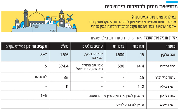 חודשיים וחצי לפני הבחירות המוניציפליות בירושלים המועמדים המובילים עסוקים בגיוס כספים אינטנסיבי. זאב אלקין כבר גייס 1.5 מיליון שקל בערבות של יוצאי רוסיה, משה ליאון מתכוון לממן את הקמפיין מכספו ורחל עזריה קיבלה ערבות מבעלה