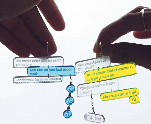 מעצבת התכשיטים אדה צ'ן נולדה בסן פרנסיסקו להורים שהגיעו מסין, והשורשים שלה הם נושא מרכזי בעבודותיה. היצירה האחרונה שלה נולדה מצ'אטים שנוגעים למוצאה, שאותם היא הפכה לעגילים צבעוניים וחמודים במיוחד. 160 דולר לזוג.