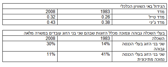 בתקופת המחקר עלה מדד טייל בישראל מ-0.26 ל-0.32. מדד ג'יני עלה באותה תקופה מ-0.38 ל-0.43. מתברר שבשנת 1983 41% מהזוגות שבהם שני בני הזוג עובדים במשרה מלאה היו בעלי השכלה נמוכה מתיכונית. הרצברג-דרוקר מסבירה שההכנסה הנמוכה אילצה אז את שני בני הזוג לעבודה. נתון זה צנח לרבע. היום רק 11% מהזוגות שבהם שני בני הזוג עובדים במשרה מלאה הם בעלי השכלה נמוכה. לעומת זאת שיעור הזוגות ששניהם עובדים במשרה מלאה בעלי השכלה גבוהה הכפיל עצמו ויותר מ-14% ל-30%.