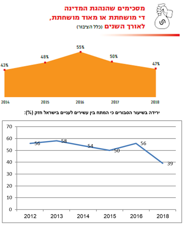 54% מהישראלים מסכימים עם האמירה שישראל היא לא דמוקרטיה אמתית משום שקבוצה קטנה של עשירים משפיעה על השלטון, כך שהוא מקבל החלטות לטובתם ונגד האנשים הפשוטים. עם זאת מצביעי השמאל (65%) והמרכז (60%) מסכימים עם אמירה זו בשיעורים גבוהים יותר ממצביעי הימין (45%).