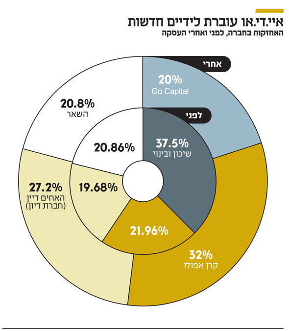 קרן אפולו תרכוש 10% ותעלה לאחזקה של 32%, האחים דיין ירכשו 7.5% ויגיעו ל־27.2%, ולעסקה יצורף הגוף הפיננסי Go Capital, שירכוש 20%. זאת כדי להימנע מהצעת רכש בחברה־הבת איי.די.או פרופרטיז, שבה מחזיקה איי.די.או ב־38.4%. על פי הערכות, לא יהיה בשלב זה הסכם שליטה.