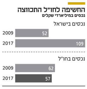 בשנים 2017-2009 נרשמה גם ירידה משמעותית בהשקעה של החברות הישראליות בנכסים מניבים בחו"ל. ב־2009 החברות הקצו 54% מהשווי ההוגן לנכסים בחו"ל, בהשוואה ל־34% ב־2017. בבנק ישראל לא מציינים מה מביא לירידה בחשיפה לחו"ל, אולם נראה שאחד הגורמים לכך הוא העובדה שחברות נאלצו לממש נכסים כדי להימנע מהסדרי חוב. כך, לדוגמה, כלכלית ירושלים, שהיתה בשליטת אליעזר פישמן ומנוהלת כיום על ידי דודו זבידה, מימשה נכסים מניבים בחו"ל בשווי של יותר משני מיליארד שקל כדי להינצל מהסדר חוב.