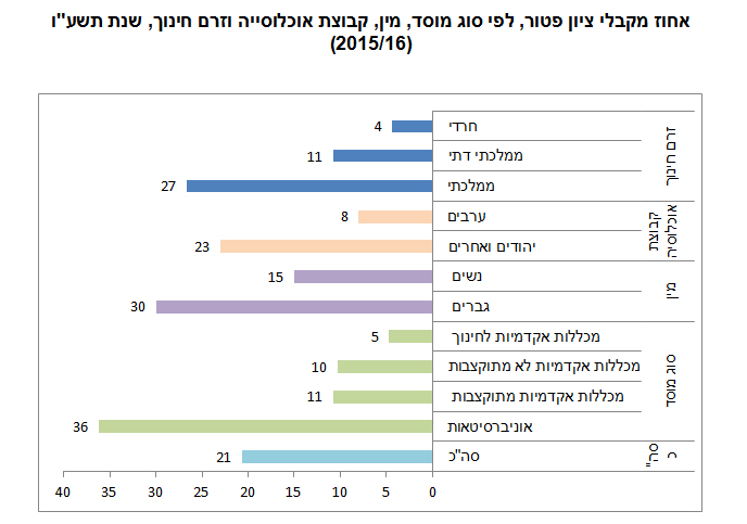 זאת, לעומת 10% בלבד באוניברסיטאות. מנתוני הלמ"ס עולה עוד, כי רק 9% מהסטודנטים שהתמחו בהוראת אנגלית במכללות אקדמיות לחינוך קיבלו ציון פטור באנגלית. רק 8% מהסטודנטים הערבים הגיעו לרמת פטור באנגלית, לעומת 23% בקרב היהודים