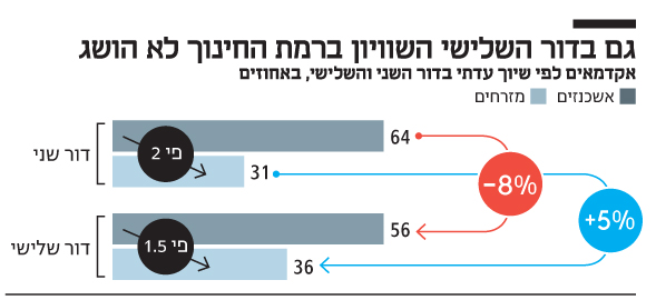 בדור השלישי שיעור האקדמאים בין האשכנזים עומד על 56% ובין המזרחים על 36%, פי 1.56. חלק מצמצום הפער נובע מעלייה בשיעור האקדמאים המזרחים מ־31% ל־36%. אבל הבשורה המביכה היא, שרוב הצמצום בפער נבע מירידה בשיעור האקדמאים האשכנזים מ־64% ל־56%.