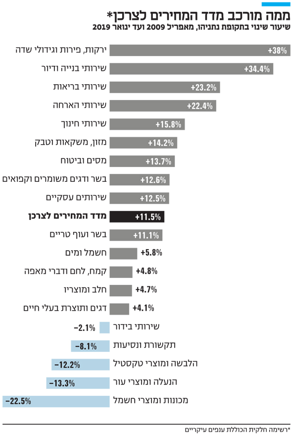 כאשר צוללים אל השינוי במחירים לפי מוצרים סחרים ובלתי סחירים בתקופת ממשלות נתניהו - מאפריל 2009 ועד ינואר 2019 - הנתונים מספרים סיפור ברור מאוד: מחירי הנעלה, הלבשה, כלי בית, ריהוט, מוצרים חשמליים, צעצועים, תיקים ומשקפיים צנחו בעשרות אחוזים. מדובר במוצרים שניתנים לרכוש בקלות באינטרנט או כאלה שאין עליהם מגבלות יבוא. מנגד, באותה תקופה התייקרו במיוחד שירותי חינוך, שכר דירה, ביטוחי בריאות של קופות החולים, שירותים רפואיים אחרים, ביטוחים אחרים, שירותי דואר, גז, מסים עירוניים, נופש, שיפוצים ושורה של שירותים נוספים.