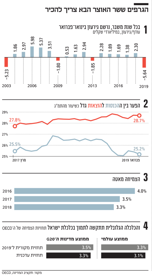 הגירעון של החודש החולף היה הגבוה בכל הזמנים; ב־20 השנים האחרונות נרשם עודף בינואר־פברואר, למעט שלוש השנים שבהן המשק נקלע למשבר; ובינתיים הצמיחה מאטה והמנועים שלה נחלשים, ולא ניתן לסמוך על חיזוק מצד הכלכלה הגלובלית