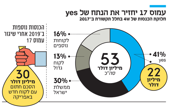 כ־30% מהכנסות חלל תקשורת, שערכם כ־21.7 מיליון דולר, יוחסו ב־2017 ל־yes, שהכנסותיה באותה שנה עמדו על 74 מילון דולר. אך יעברו עוד שנים עד שבזק תשלים את פריסת הסיבים האופטיים ועד ש־yes תצמצם או תפסיק את התקשרות עם חלל תקשורת. כפי שנחשף ב"כלכליסט" בשבוע שעבר, yes תאריך בכמה שנים את החוזה עם עמוס 7 ואולי תשתמש לתקופה קצרה בלבד בעמוס 8, אם הוא ייבנה וישוגר, עד שיושלם פרויקט הנחת הסיבים.