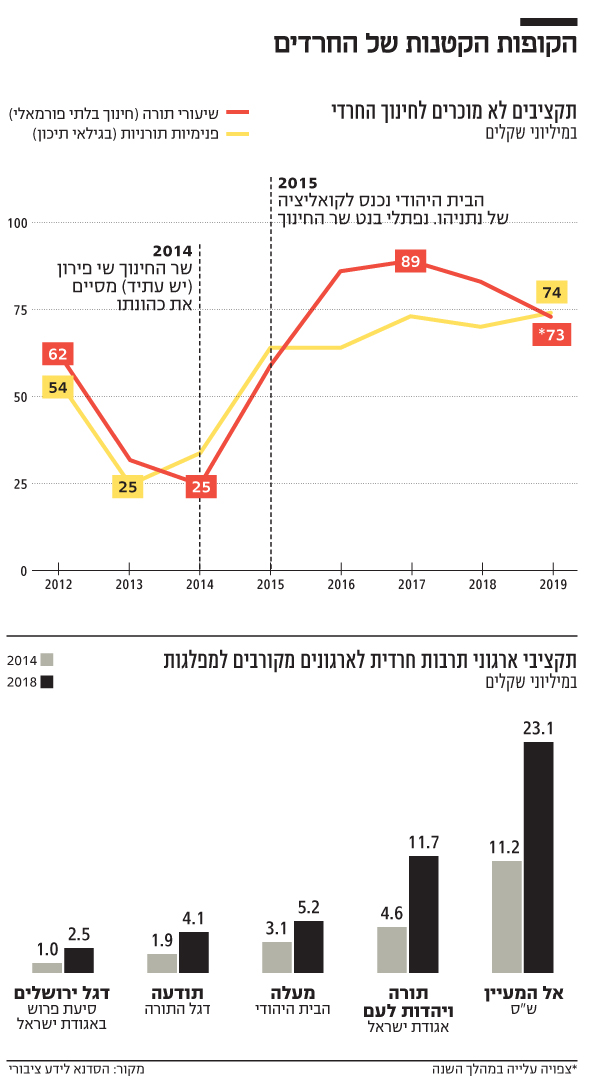 בתוך שנתיים בלבד התקציב לפנימיות של ישיבות יותר משולש. תקציב התרבות החרדית, שמתחלק בין ארגוני תרבות המקורבים למפלגות החרדיות ולארגוני החזרה בתשובה, שולש אף הוא. השותפים הטבעיים של נתניהו, כתבה ראשונה בסדרה