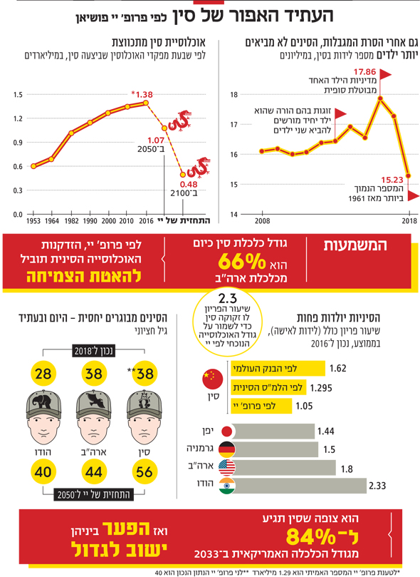 ”כשסין היתה מדינה צעירה, הכלכלה שלה צמחה מהר, אבל ככל שהיא מזדקנת ומאבדת מהחיוניות הכלכלית, הצמיחה הזו רק הולכת וקטנה. התוצאה היא שהחל מ־2033 הצמיחה הסינית כבר תפגר אחרי זו של ארה“ב, ומאותו רגע הפער בין הכלכלות של שתיהן רק ילך ויגדל. אני לא חושב שהכלכלה הסינית תצליח אי פעם להשיג את ארה“ב".