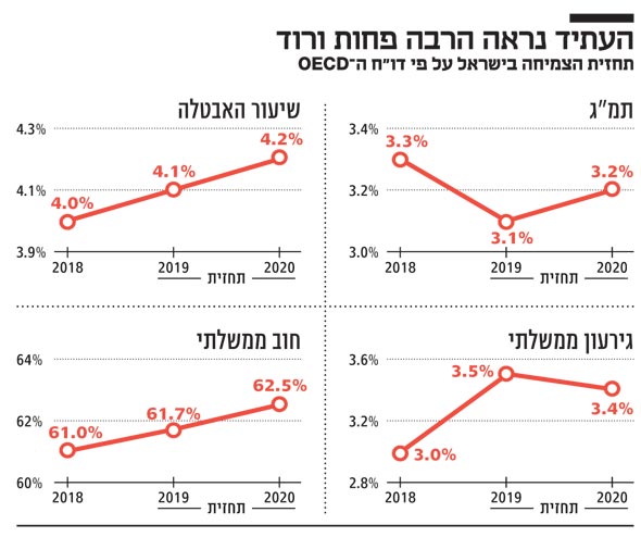 הסכנה הגדולה היא כי החוב, שכבר עלה ב־2018, יעלה שוב ושוב, וזאת עוד לפני שמביאים בחשבון את הדרישות החריגות של השותפות הקואליציוניות. לגבי הגירעון התקציבי בשנה הבאה כלכלני הארגון אינם מהמרים על "הצלחה כבירה" באתגר הראשון, אישור תקציב מאוזן של ממשלת נתניהו החדשה: כ־3.4% מהתמ"ג - השני בגודלו במערב אחרי ארה"ב והרחק מאוד מהממוצע של המדינות המפותחות (רק 0.3% מהתמ"ג).